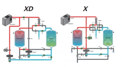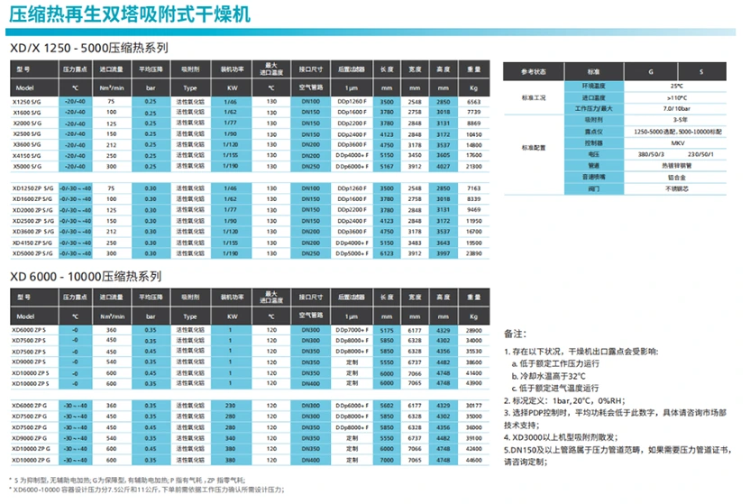 Nutzt die thermische Kompressionsregeneration und erreicht je nach Regenerationstemperatur und Umgebungsbedingungen einen Taupunkt von -20 °C oder weniger; In Kombination mit einem ölfreien Kompressor mit hoher Abgastemperatur kann der Taupunkt -40 °C erreichen.