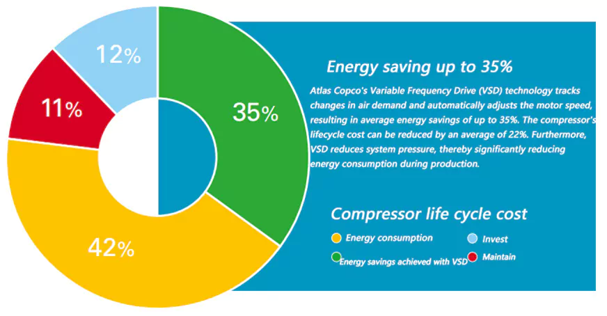Der Energieverbrauch macht über 80 % der gesamten Lebenszykluskosten eines ölfreien Schraubenluftkompressors aus. Darüber hinaus macht der Strom für die Druckluftproduktion über 40 % der gesamten Stromkosten einer Fabrik aus. Um die Energiekosten zu senken, hat Atlas Copco die Technologie des variablen Frequenzantriebs (VSD) in der Druckluftindustrie eingeführt. VSD spart nicht nur erhebliche Mengen an Energie, sondern schützt auch die Umwelt für zukünftige Generationen. Dank kontinuierlicher Investitionen in diese Technologie ist Atlas Copco in der Lage, die größte Auswahl an integrierten VSD-Kompressoren auf dem Markt anzubieten.