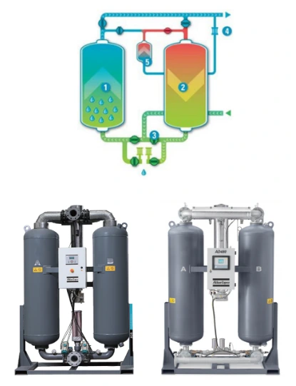 Die regenerativen Adsorptionstrockner mit Mikrowärme der A-Serie verwenden ein Trockenmittel, um Feuchtigkeit aus der Druckluft zu adsorbieren. Jede Maschine besteht aus zwei identischen Türmen. Sie wechseln nach jedem Zyklus die Funktion.